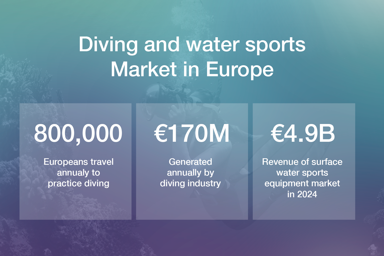 The European diving and watersports market is dynamic and highly competitive, supported by a strong base of enthusiasts and specialized companies. Over 800,000 Europeans travel each year to dive, fueling an industry worth more than €170 million annually. The surface watersports equipment sector alone generated approximately €4.9 billion in 2024, with steady growth expected in the years to come.